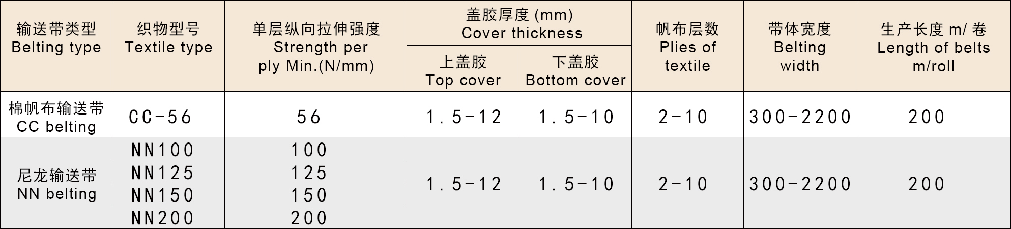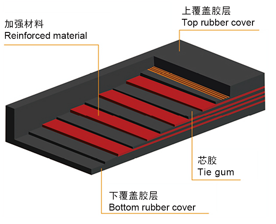 骨架受力体为多层化纤帆布,层间为贴胶,加覆盖胶。可按DIN22102.AS1332、GB7984.JISK6322等标准生产各种强力及盖