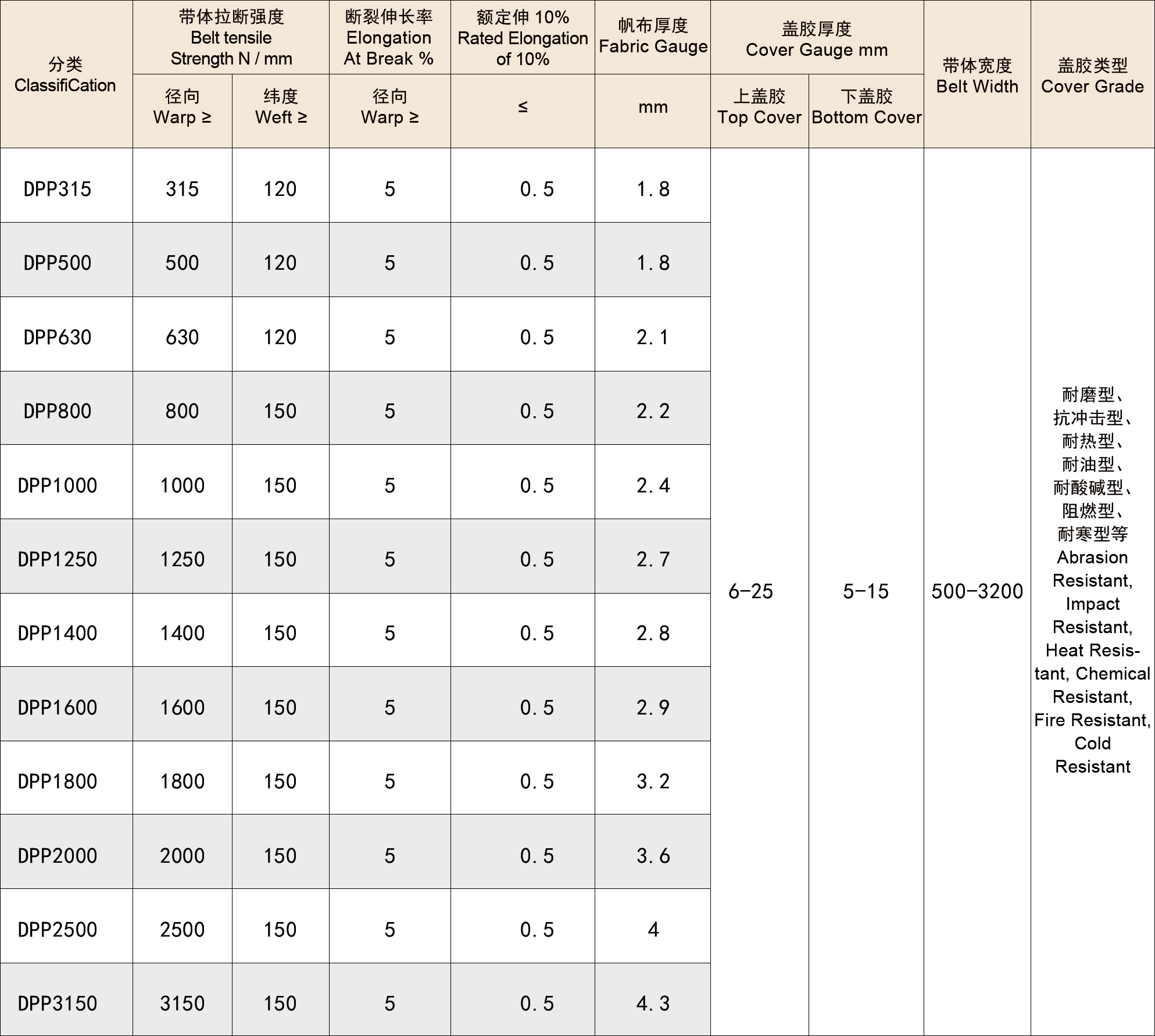 骨架材料采用高强力芳纶与锦纶66直径直纬复合帆布。这种结构的特点是帆布的强度保持率高、伸长小(<0.5%)、横向耐冲击性能佳。因此不需要添加抗撕裂网。芳纶帆布输送带适用于高强度、长距离、大运量的输送系列。配合耐磨耗、耐热、难燃或阻燃盖胶,可适应于各种挑战的工况。